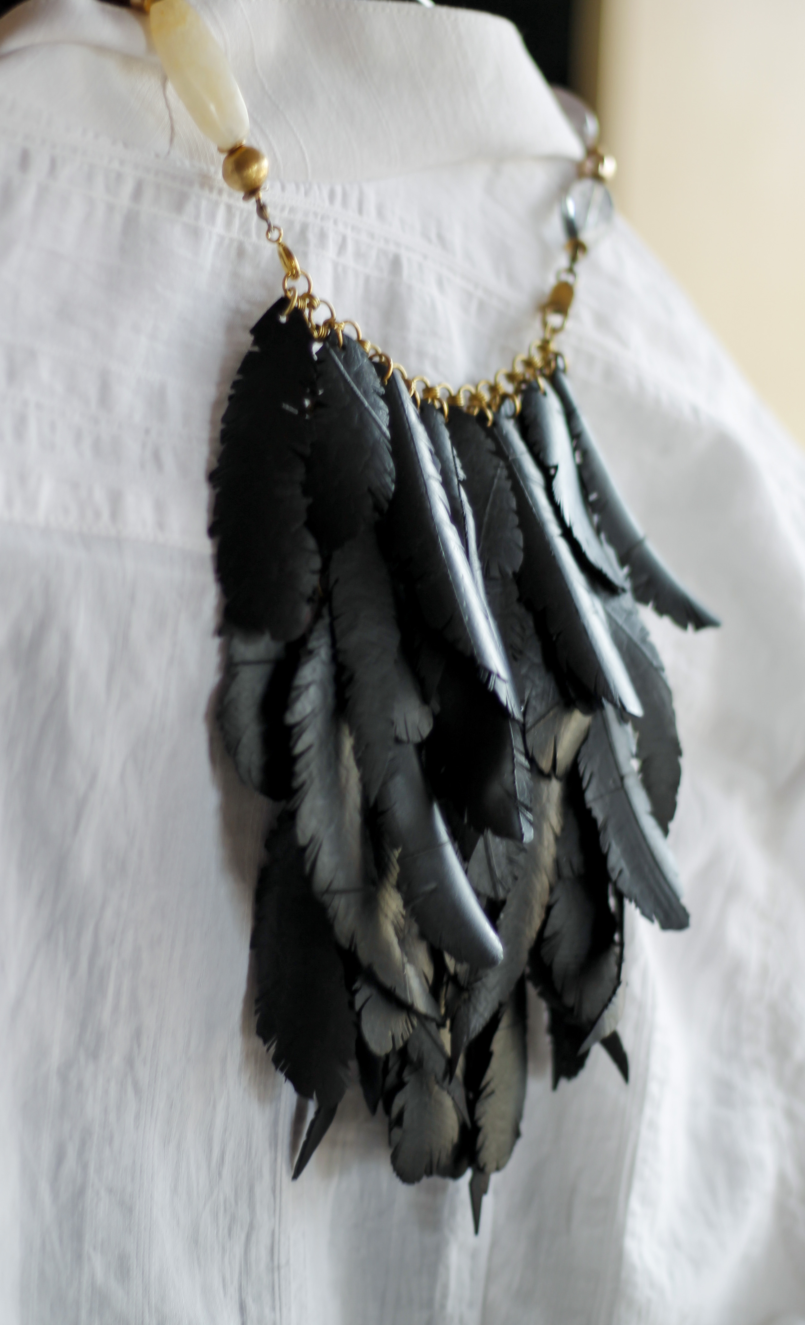 Collana lunga con piume nere Corvo, fatta a mano con camera d’aria riciclata di biciclette e pietre dure, amore e rispetto per la Natura. Ogni pezzo è unico.