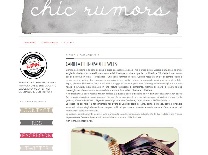 Camilla Pietropaoli Eco-Design è il progetto artigianale di Camilla, giovane designer italiana che, a partire da materiali di recupero come le camere d’aria delle biciclette, realizza gioielli unici ed eco-friendly. L’amore per l’artigianato è nato dall’esigenza di ritagliarsi uno spazio di libertà e creatività, e oggi cura la sua attività a 360 gradi.
